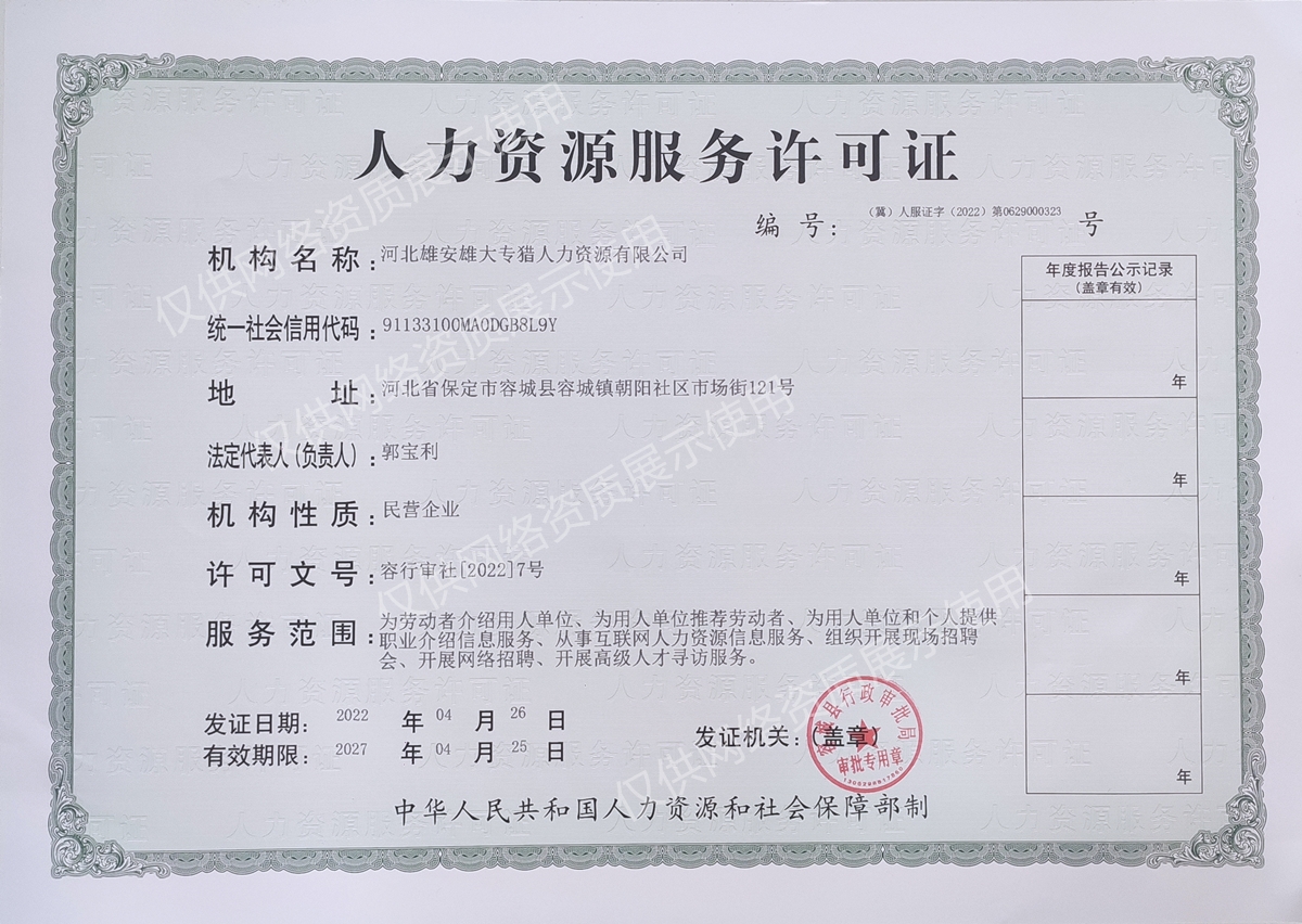 人力资源服务许可证:(冀)人服证字(2022)第0629000323
